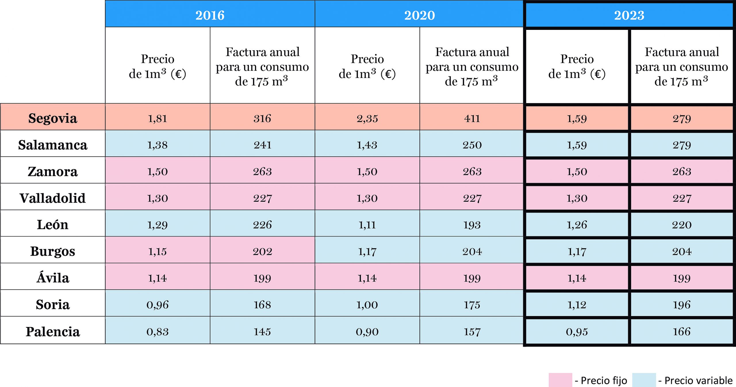 En este nuevo año 2023, y tras ocho años de más subidas que bajadas, parece que el precio del agua en Segovia se estabiliza y da, por fin, algo de tregua. Con 1,59 el m³ y 279 anuales, nuestra capital ha sido la única que ha visto disminuir el coste de este bien desde el año 2020. Eso sí, continúa siendo la más cara de toda Castilla y León (empatada con Salamanca, ciudad con casi el triple de habitantes).