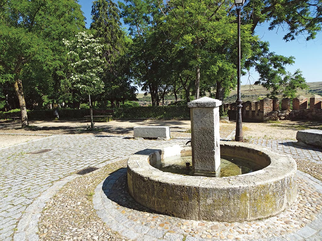 De sur a norte, la plaza, limitada por una alineación de viviendas y la iglesia, se divide en cuatro partes: una calle ancha, un talud, un parterre entre dos senderos paralelos y la banda que, cerrada con verja, discurre al pie de los muros del templo. De oeste a este, esos elementos van desde la calle que lleva a la fachada principal del templo, hasta un sector de la muralla. Junto a ésta se cierran con una fuente circular, recuerdo del que pudo ser abrevadero, parterre con un surtidor, otra plazoleta y varios cuadros, dos rectangulares que continúan el parterre y dos triangulares, adaptados en su forma a la construcción almenada, donde acaba el conjunto. En su interior, los cuatro cuadros llevan césped, árboles y arbustos, dispuestos con cierto desorden, respondiendo a una característica de la jardinería segoviana, que primero puso árboles y luego, respetándolos, trazó jardines adaptados a los árboles en su diseño y trazado.