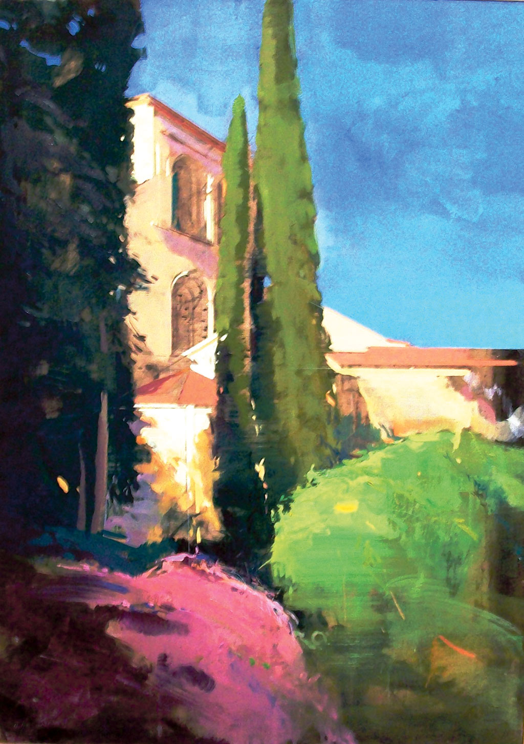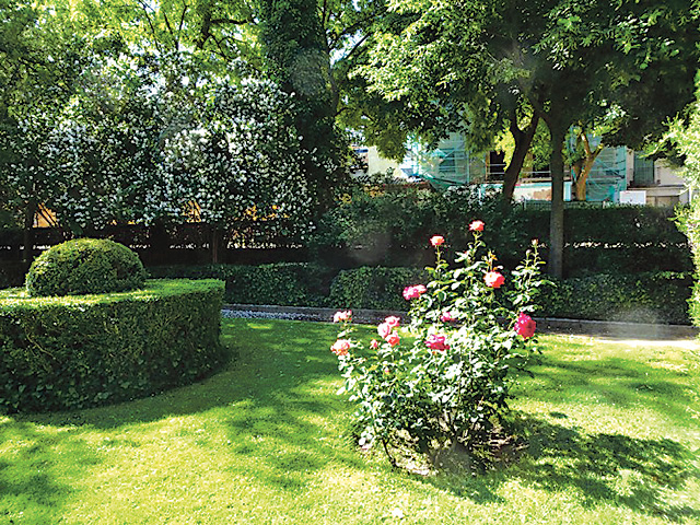 Envolviéndolo todo y en todo momento salvo que la nieve lo haya encubierto con su blanco manto, está el verde, en todas sus gamas y matices; el verde del césped, de los setos, de los variados arbustos y de los árboles, convertido en estuche para la joya de marfileño color que es la vieja iglesia románica.