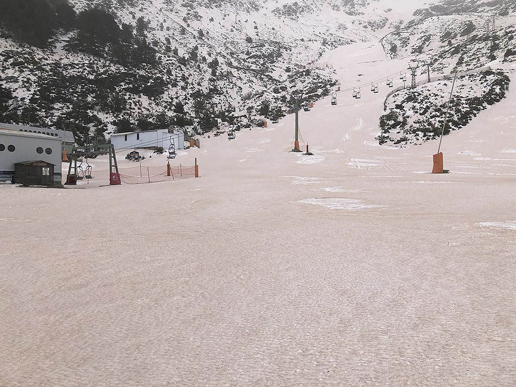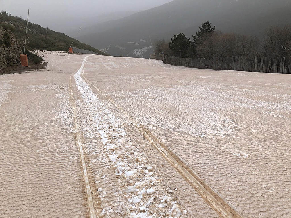 Esta circunstancia provocada por los vientos de la borrasca ‘Celia’, que inyecta aire procedente del continente africano y da lugar a estas ‘lluvias de barro’, deja serios problemas para que la nieve se mantenga con el fin de desempeñar la actividad deportiva, puesto que el peso de las particulas de polvo va ganando terreno.