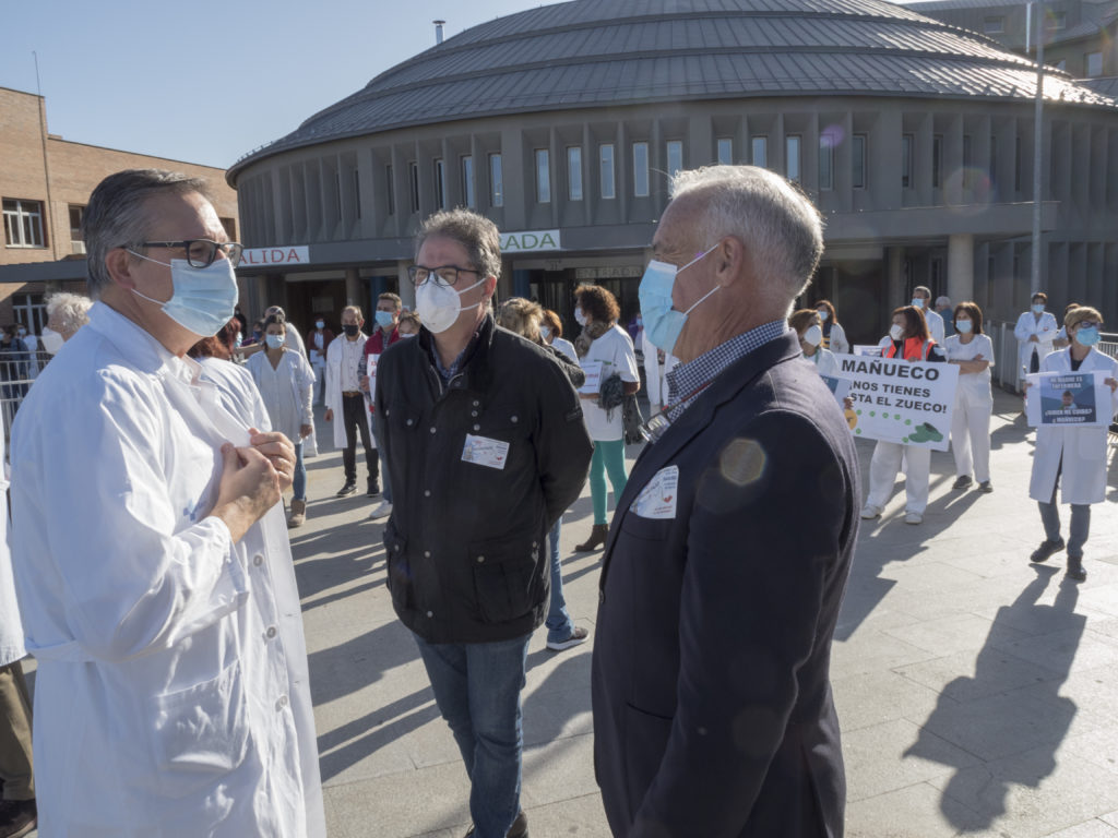 Unos 250 profesionales de la sanidad, según datos ofrecidos por Policía Nacional, se han concentrado en la puerta del Hospital General, encabezados por representantes de sindicatos como el secretario general de Fesp-UGT en Segovia, Miguel Ángel Mateo.