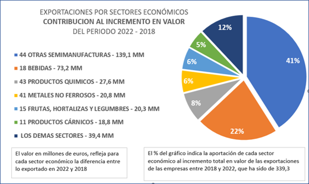 El gráfico previo muestra el gran impulso al valor de nuestras exportaciones que han aportado principalmente los sectores económicos de las semi manufacturas, con un incremento en valor de 139,1 millones de euros y una contribución del 41% al incremento en el periodo y las bebidas, con 73,2 millones y el 22% de contribución.