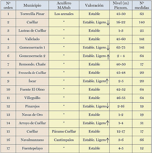 En un entorno zonal, la piezometría (nivel freático) está más baja en la zona oeste de la provincia (Fresneda, Remondo, Chañe, Villeguillo), con niveles estables en torno a los 40-50 m de profundidad. En la parte norte-central de la zona estudiada, los niveles son más altos (Lastras de Cuéllar, Pinarejos, Navalmanzano, Gomezserracín), con profundidades entre los 5 y 20 m, donde se localizan ligeros aumentos y descensos de niveles.