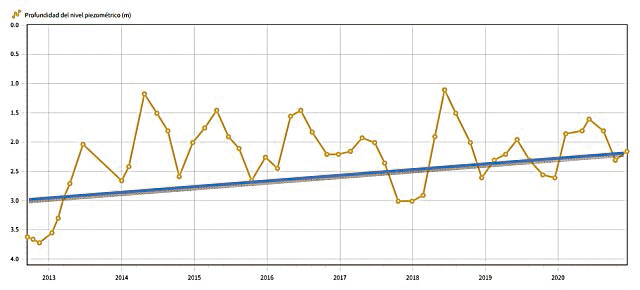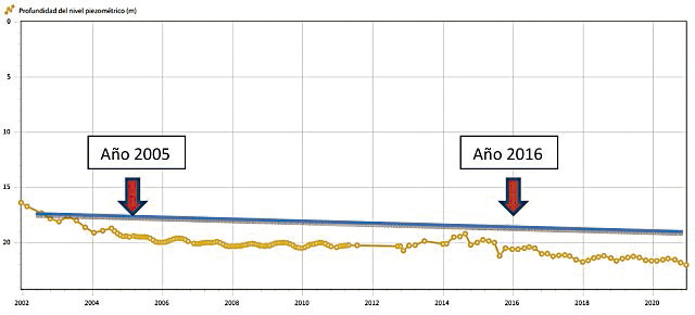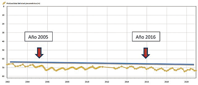 Este hecho común y temporal en varios sondeos no se ha investigado en profundidad, pero se tienen indicios de que pueda ser por la bajada paulatina de precipitaciones generalizadas en la zona debido al cambio climático, lo que ha generado a su vez, la bajada de recarga natural y artificial.