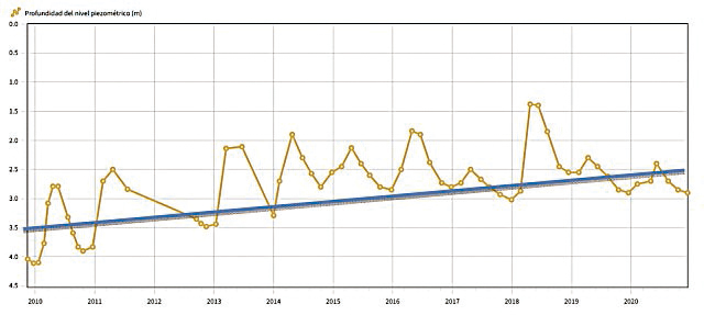 Sondeos de Gomezserracín. La serie histórica más larga con 140 puntos también se inicia en el año 2001 y tiene un ligero descenso hasta el año 2005 que se estabiliza, con otro ligero descenso a partir del año 2016. De este piezómetro de gran profundidad (-564 m) no hemos conseguido su litología, pero es muy posible que conecte varias capas acuíferas profundas, por lo que se observan profundidades entre los 65-75 metros, con niveles estables. Además, existen otros dos sondeos de menor profundidad que recogen las capas acuíferas más superficiales y con mayor permeabilidad, con niveles estables entre los 2 y 5 metros de profundidad, con un aumento de nivel de 1 metro en los últimos 13 años (Fig. 3 y 4).